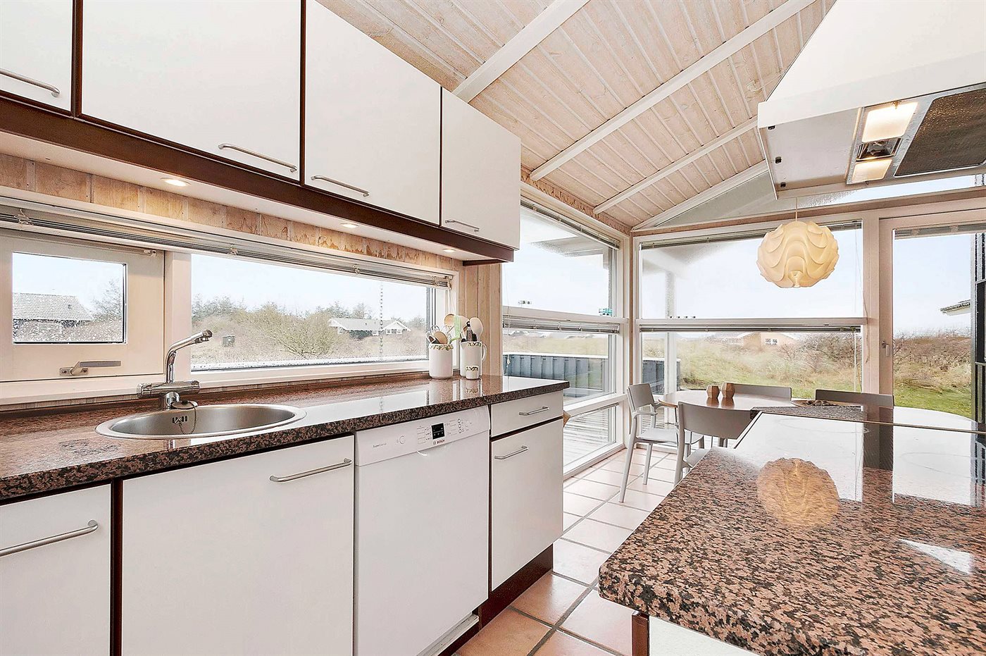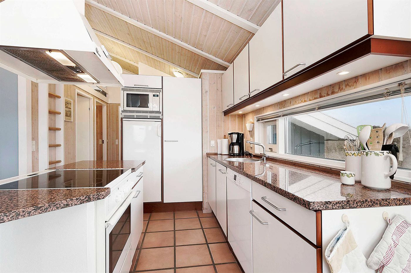 Der er et veludstyret køkken med opvaskemaskine, mikrobølgeovn, komfur, køleskab med lille fryser foroven. I skuret er der desuden en stor kummefryser på 100 liter.