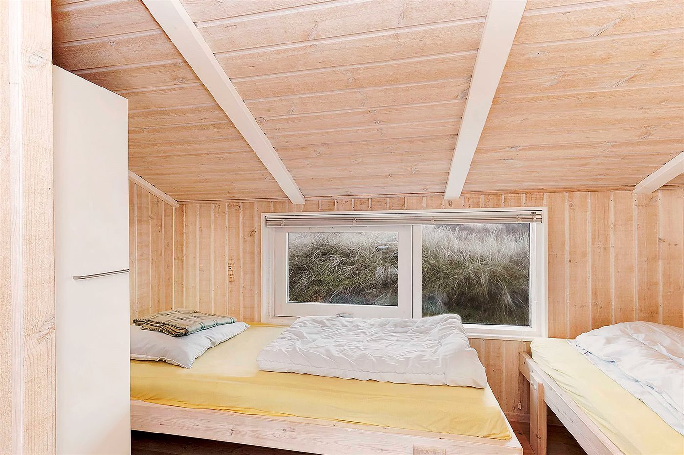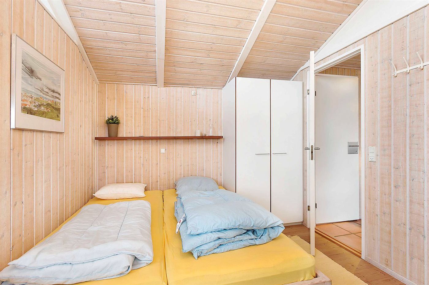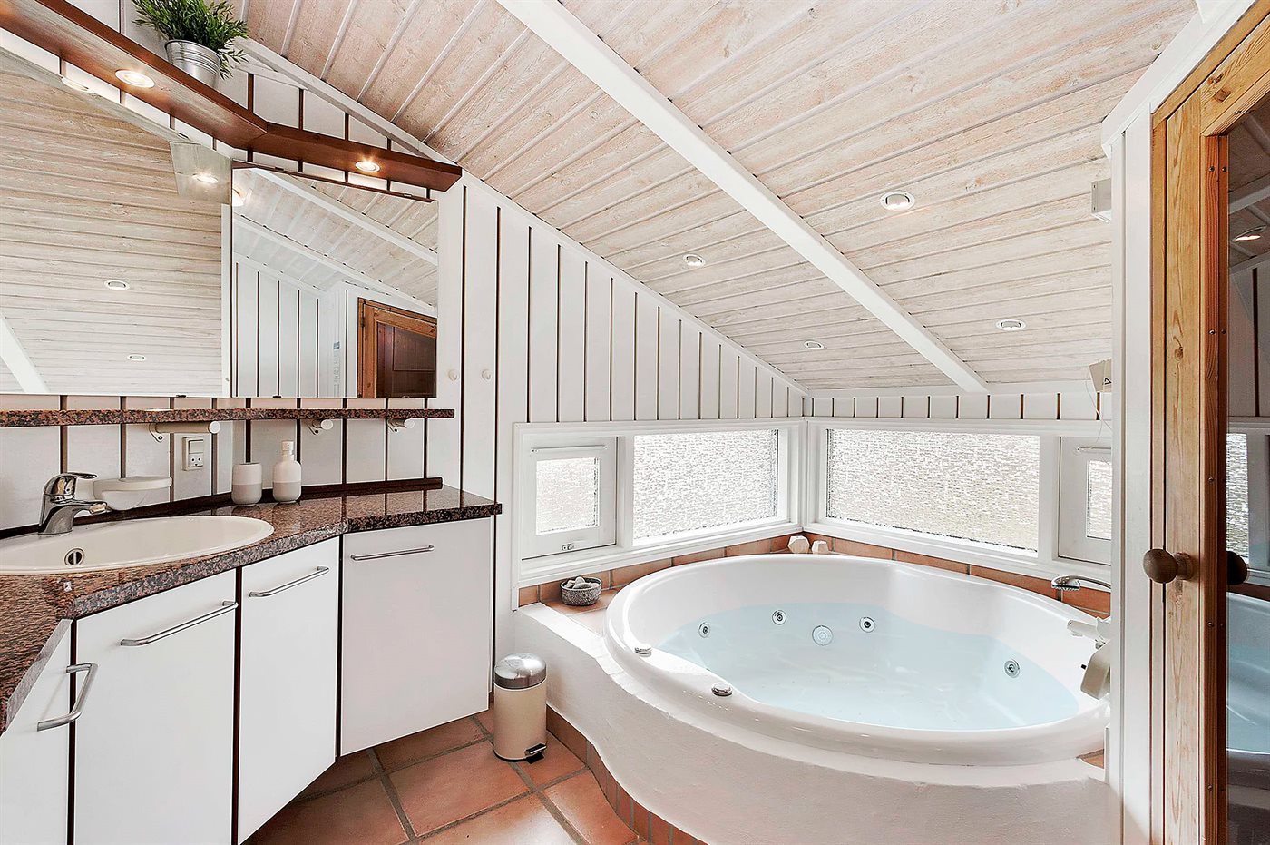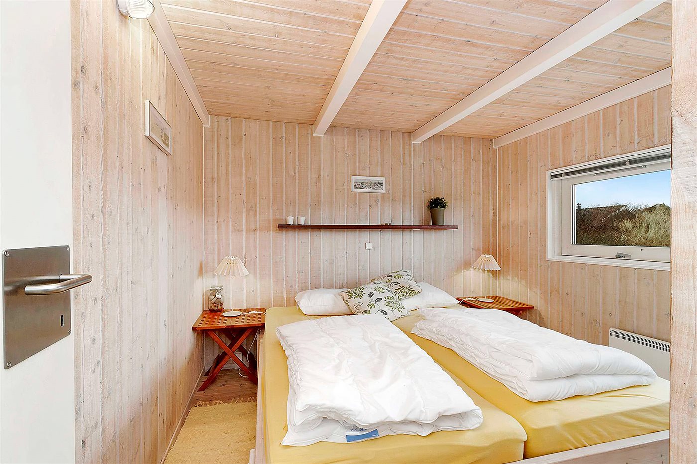 To værelser med dobbeltseng og to værelser med hver to enkeltsenge. Huset er indrettet med to pæne badeværelser. Det ene med en dejlig 4 pers. spa, sauna og bruseniche og det andet med bruseniche. På begge badeværelser er der gulvvarme.Der er trægulve i værelserne og klinkegulv med gulvvarme i gang, køkken og stue samt